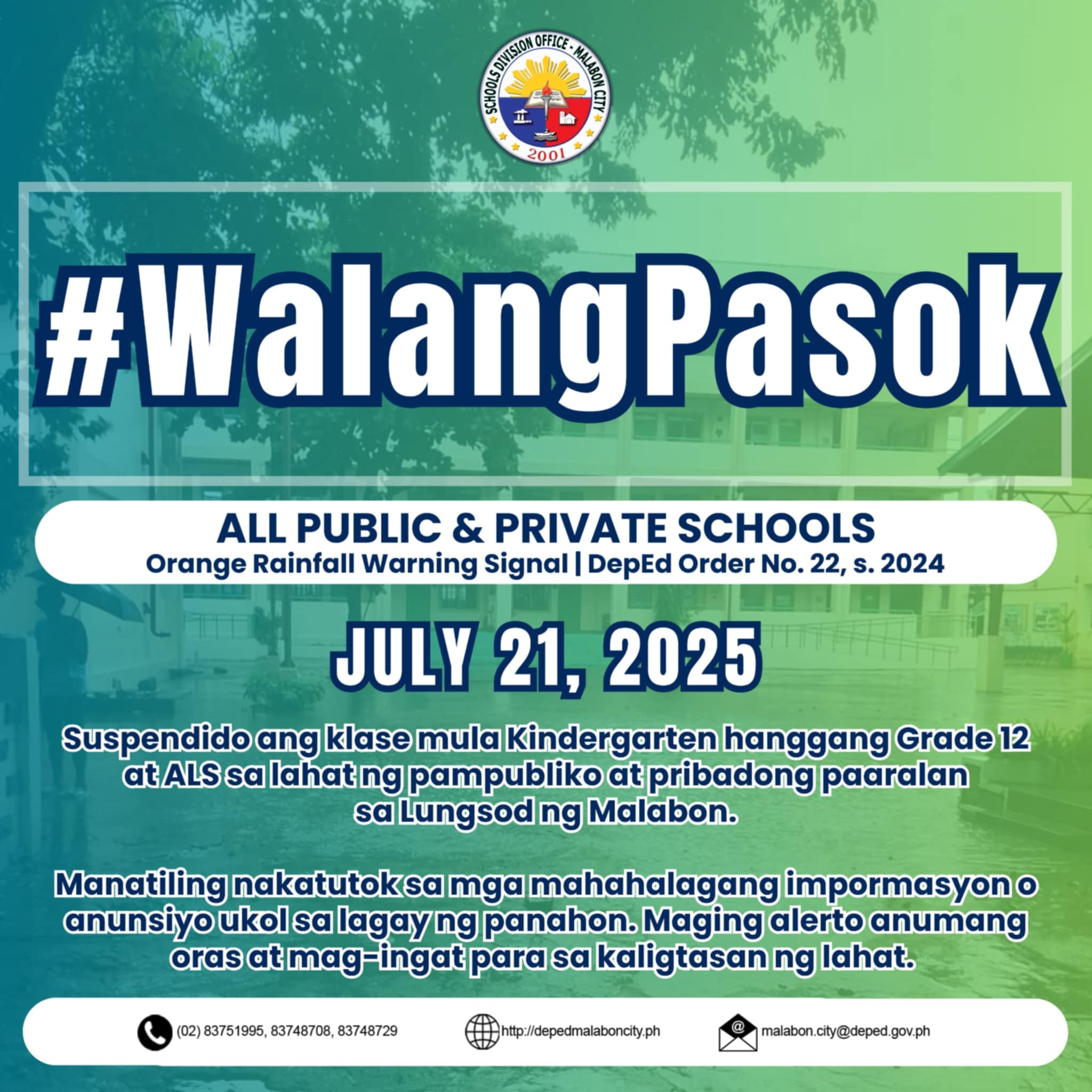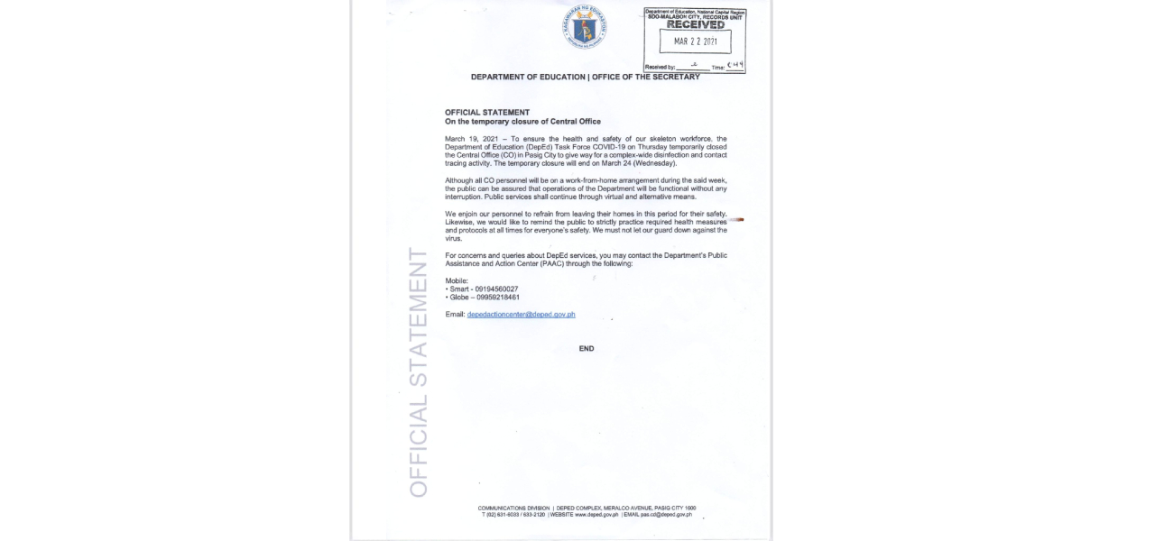 Opisyal na Pahayag Ang SDO Malabon City, bilang ahensiya ng pamahalaan ay patuloy na naglilingkod para sa kapakanan at kabutihan ng kagawaran at ng mga kabataang Pilipino. Hangad po naming makatugon sa lahat ng inyong pangangailangan sa abot ng aming makakaya batay sa mga opisyal na kautusan. Kaugnay continue reading : Opisyal na Pahayag