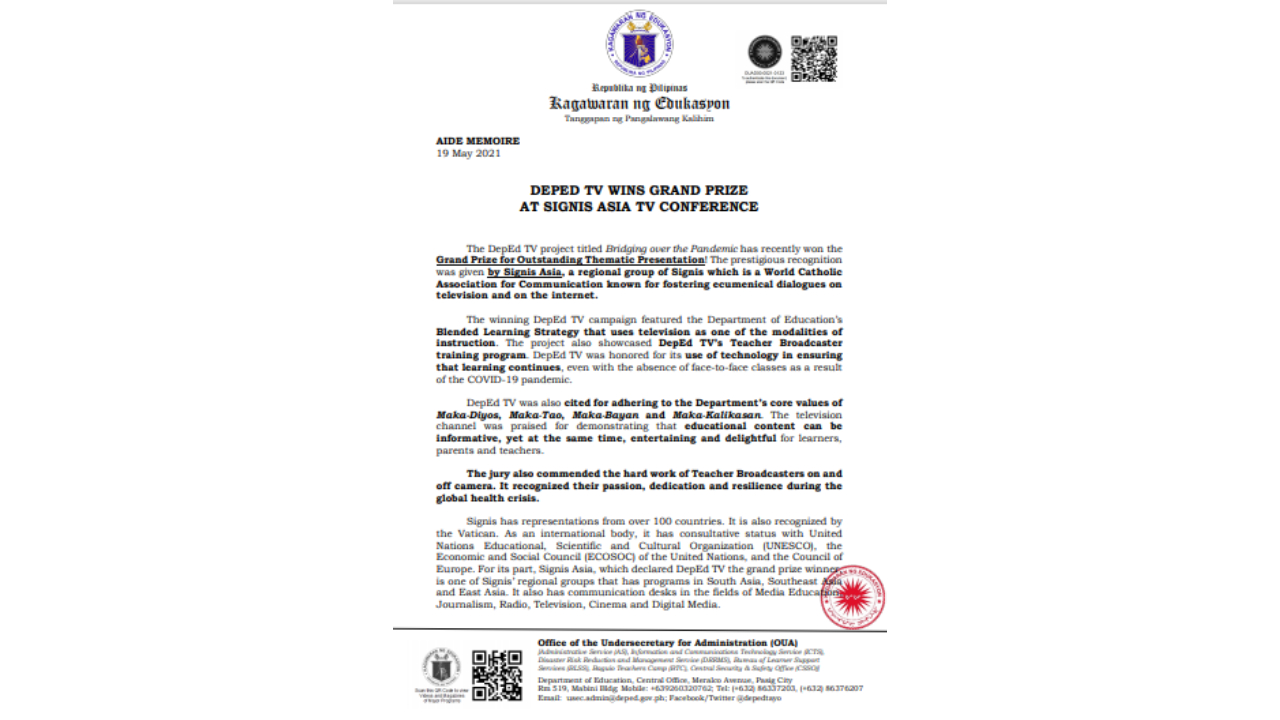 ABANGAN : Ang inihandang webinar ng Sangay ng Implementasyong PangKurikulum sa darating na Nobyembre 7, 2020, mula 8:30 n.u. hanggang 12 ng tanghali. Tatalakayin sa webinar na ito ang mga gabay at patnubay ukol sa pagpapatupad ng Kautusang PangKagawaran Blg. 31, s. 2020 o ang pansamantalang patnubay para sa pagtatasa at pagmamarka sa kasalukuyang panahon continue reading : TINGNAN