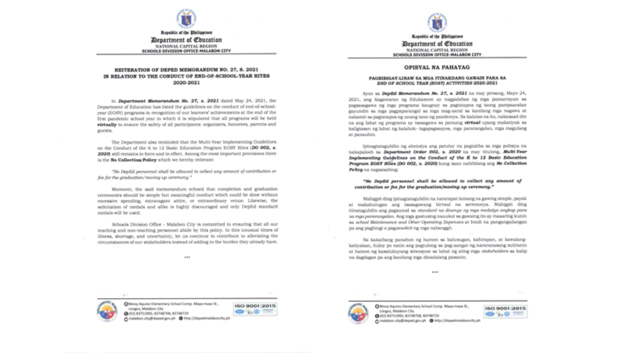 OFFICIAL STATEMENT AND REITERATION OF DEPED MEMORANDUM BO. 27, S2021 IN RELATION TO THE CONDUCT OF END-OF-SCHOOL-YEAR RITES